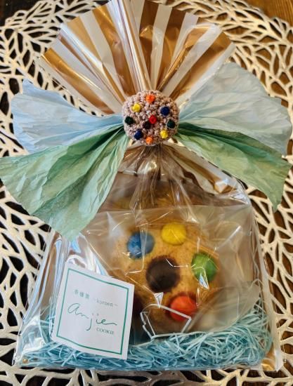 手編みのカラフルチョコクッキーのモチーフ付きのラッピング。